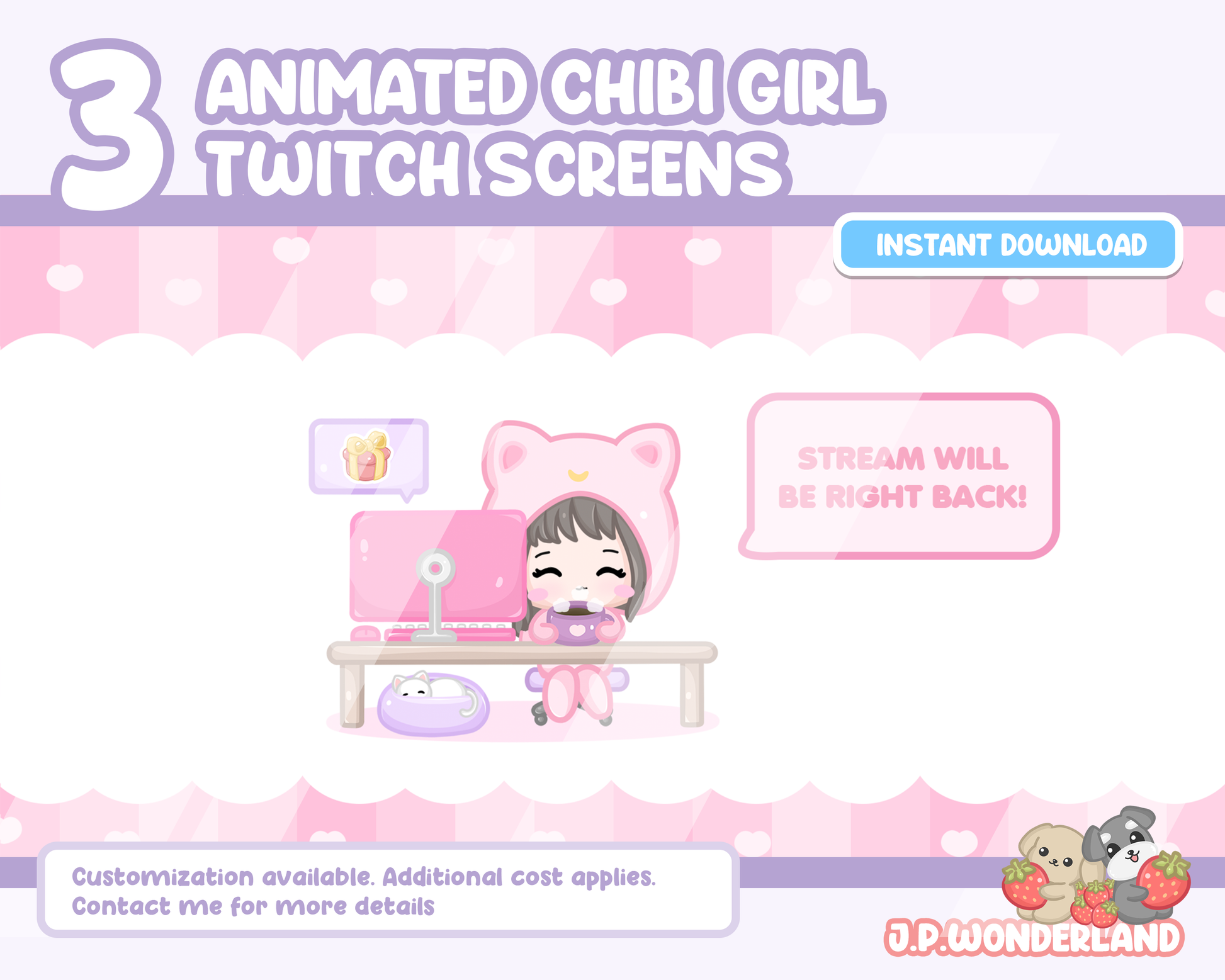 Animated Chibi Girl Twitch Screens - Starting Soon, Be Right Back, Ending Screen