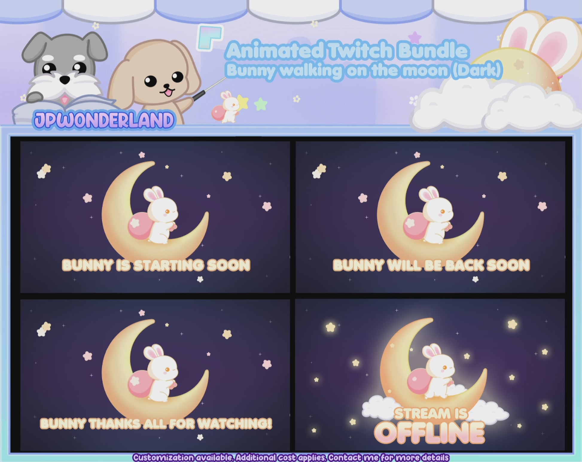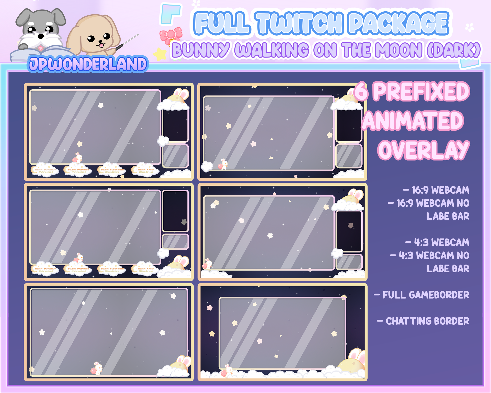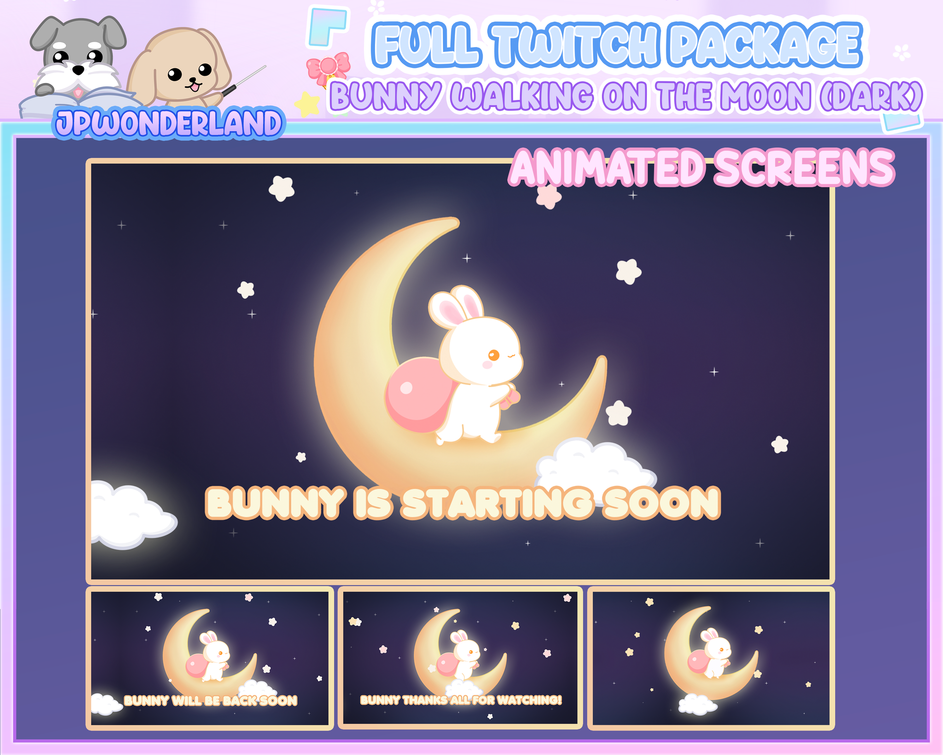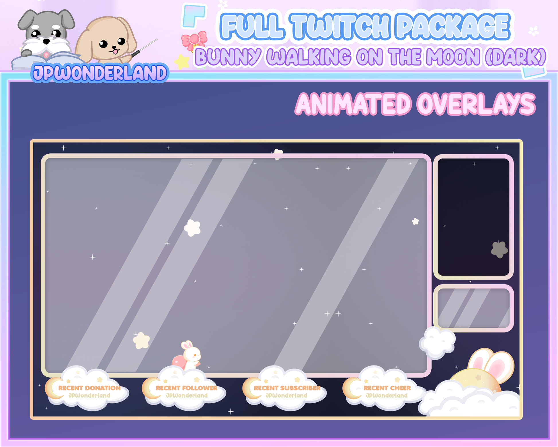 Animated Cute Bunny walking on the moon (Dark) Full Stream Bundle Package for Twitch / Youtube - Overlay Pack / Kawaii Rabbit / Moon / Star